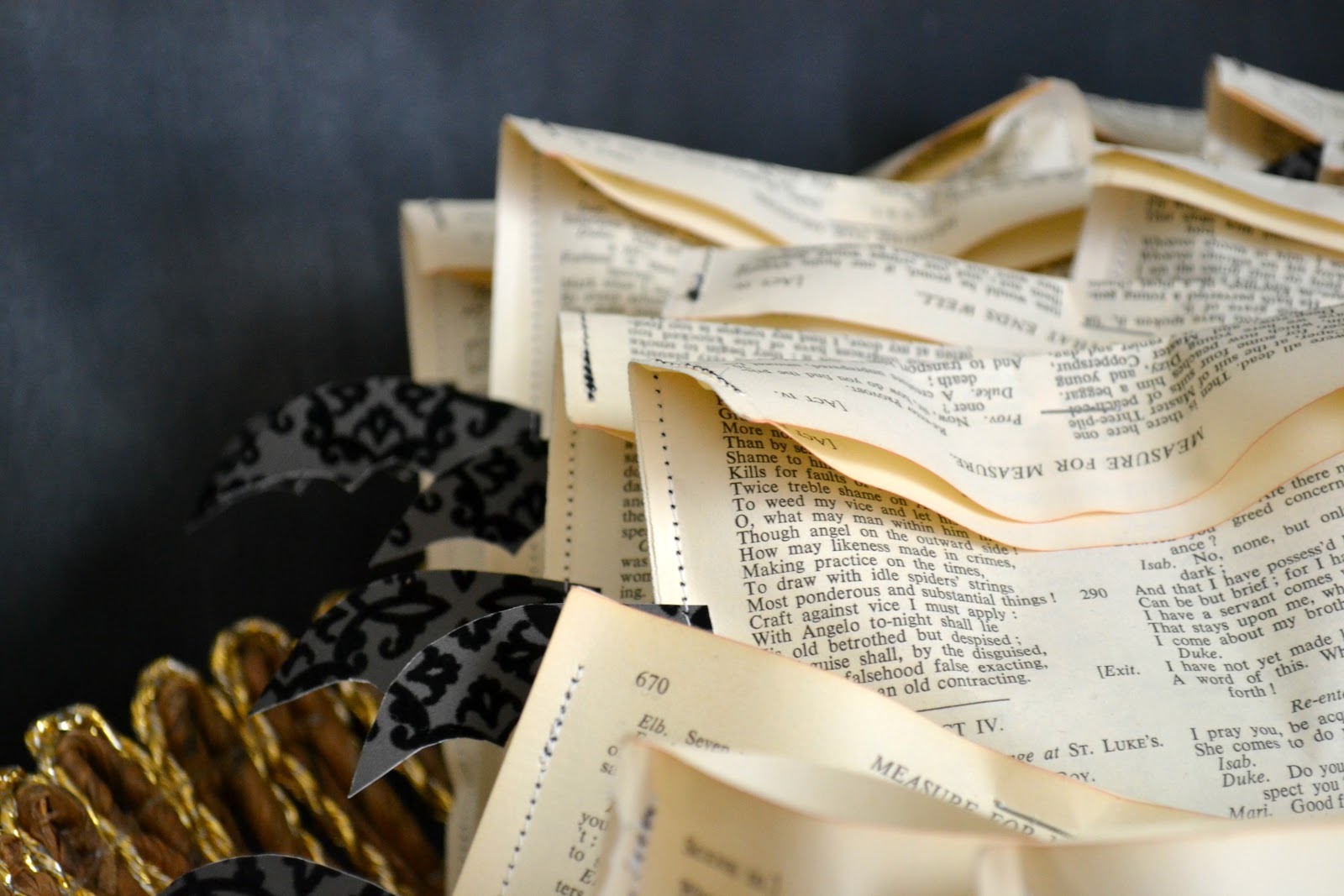 - carefully remove pages from the text book. The advantage to using a vintage book is that the binding and glue will also be equally as old and the pages tend to slip out easily, plus I love the yellowing of the pages-it lends that old eerie feel to the treat bags.